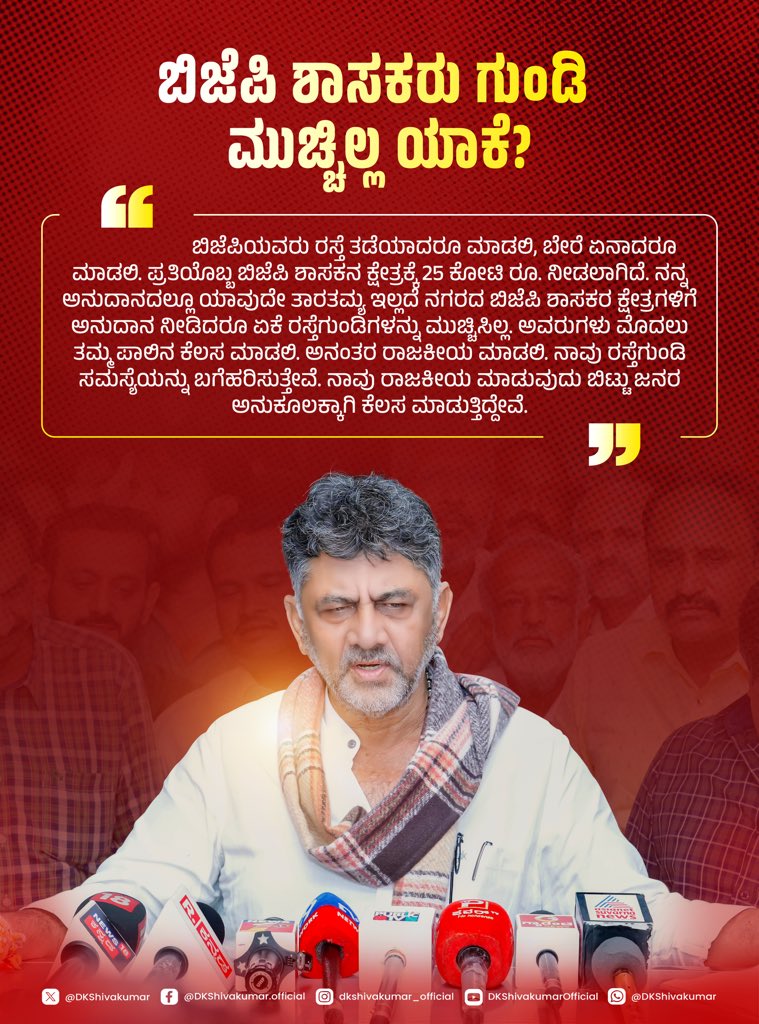 “ರಸ್ತೆಗುಂಡಿ ಸಮಸ್ಯೆ ಬಗೆಹರಿಸಲು ನಾವು ಬದ್ಧವಾಗಿದ್ದು, ಸಮಾರೋಪಾದಿಯಲ್ಲಿ ಕಾರ್ಯನಿರ್ವಹಿಸಲಾಗುತ್ತಿದೆ. ರಾಜಕೀಯ ಮಾಡುವವರು ಮಾಡಲಿ” ಎಂದು ಡಿಸಿಎಂ ಡಿ.ಕೆ.ಶಿವಕುಮಾರ್ ಅವರು ತಿಳಿಸಿದರು.